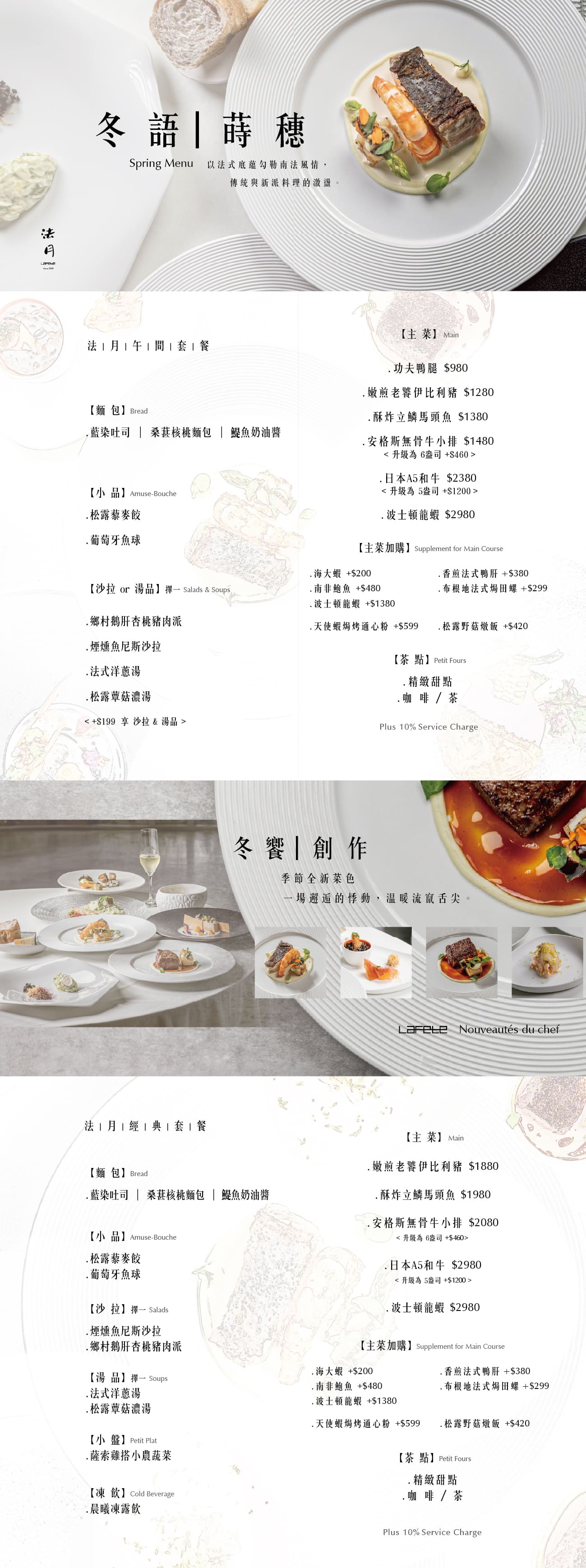 新舊交織的法式饗宴講求從食材提煉出各式原汁原味引領你的五感官能從台灣當令食材沈浸到法式傳統底蘊中感受傳統與現代的浪漫邂逅 每一道料理將在地食材透過新的詮釋,入魂於法式烹調技術,結合大地豐華之細膩手法提煉出食材原汁原味,呈現一道道星光熠熠的法月。 當日/當月壽星,法月送上『法式香頌.蛋糕寶盒』招待您!(氮氣浪漫玫瑰升級方案$399)